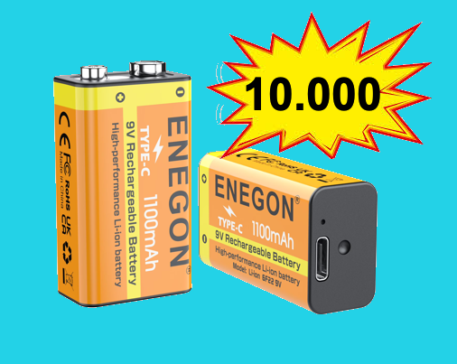 Las baterías recargables de 9 V de ENEGON ofrecen una capacidad de 1100 mAh / 9.9 Wh, brindando el doble de potencia que las baterías alcalinas normales y tres veces más que las NiMH.
